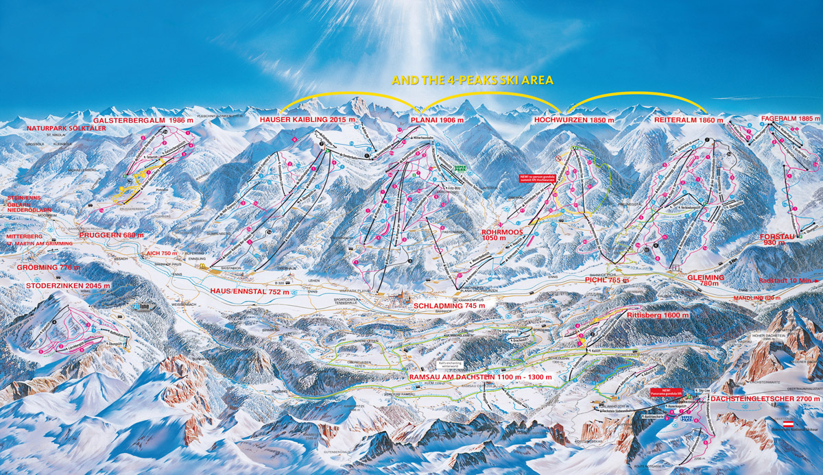 • rozsáhlá lyžařská oblast tvořena 9 skiareály: Schladming Planai - Hochwurzen, Hauser Kaibling, Reiteralm - Fageralm, Stoderzinken, Galsterberg, Ramsau, Dachsteinský ledovec, Planeralm a Riesneralm